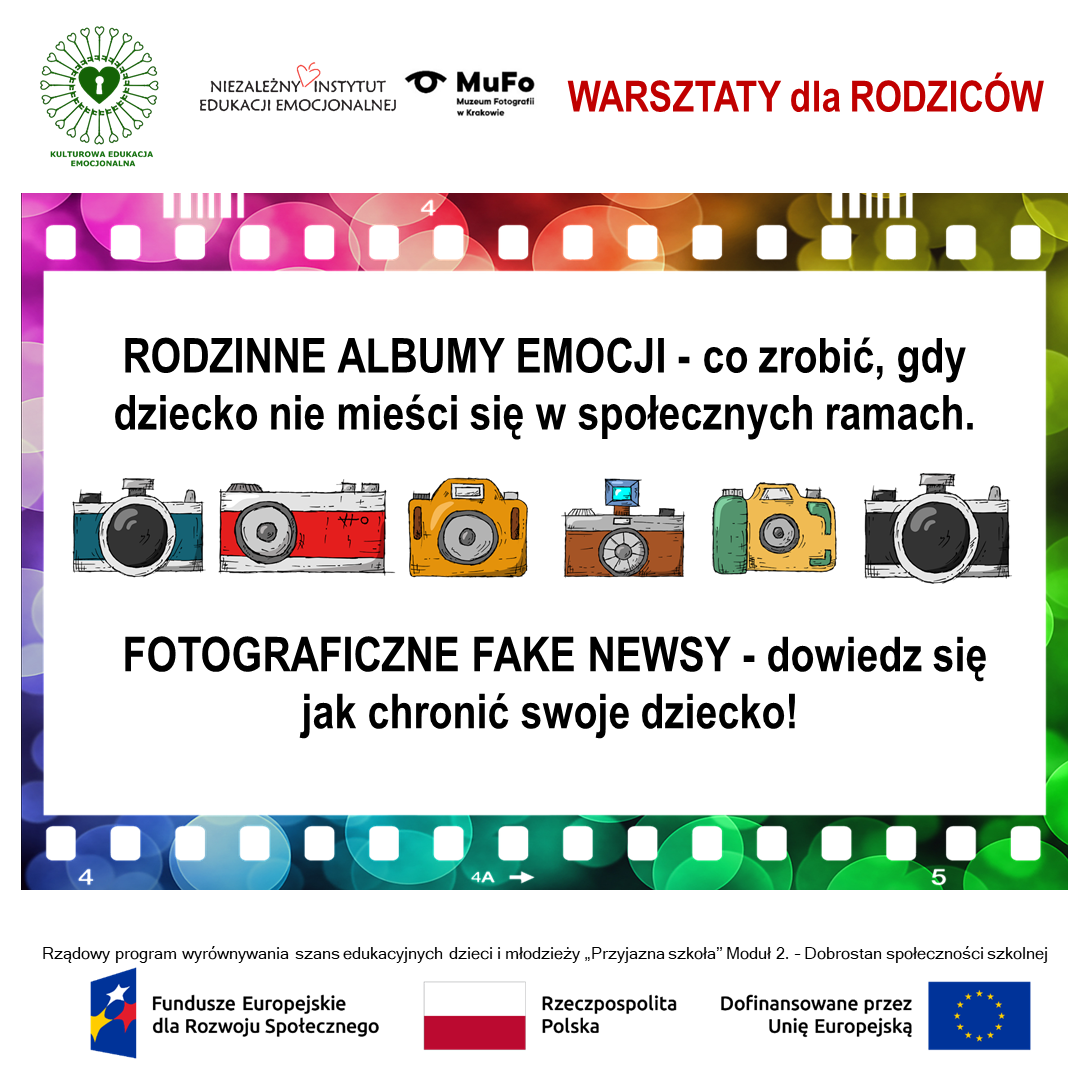 Zapraszamy do skorzystania z oferty warsztatów z zakresu kulturowej edukacji emocjonalno-społecznej, przygotowanej przez Fundację Niezależny Instytut Edukacji Emocjonalnej w ramach realizacji Modułu 2. – Dobrostan społeczności szkolnej Rządowego programu wyrównywania szans edukacyjnych dzieci i młodzieży „Przyjazna Szkoła” w latach 2025–2027. Warsztaty realizowane są m.in. w Muzeum Fotografii w Krakowie.