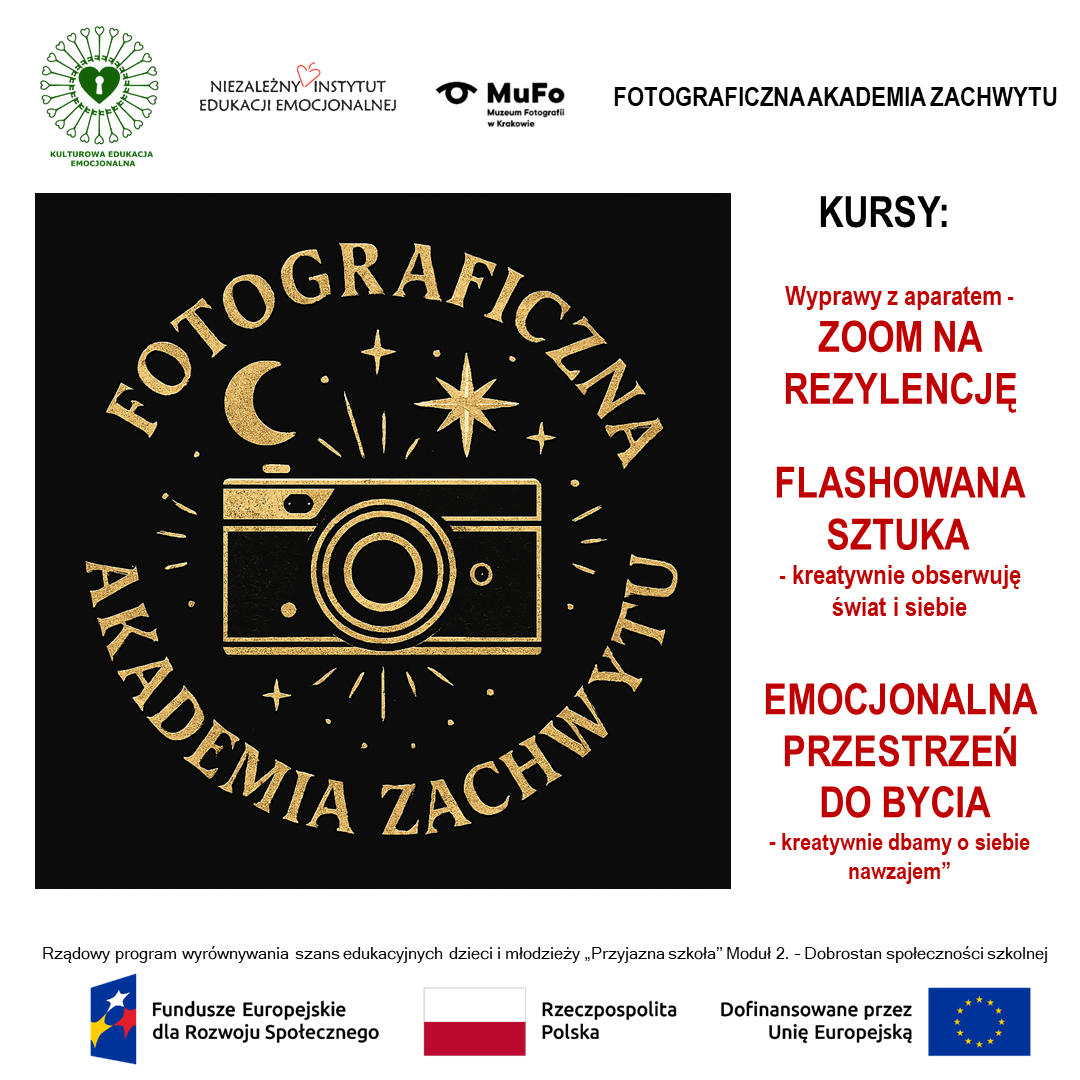 Zapraszamy do skorzystania z oferty warsztatów z zakresu kulturowej edukacji emocjonalno-społecznej, przygotowanej przez Fundację Niezależny Instytut Edukacji Emocjonalnej w ramach realizacji Modułu 2. – Dobrostan społeczności szkolnej Rządowego programu wyrównywania szans edukacyjnych dzieci i młodzieży „Przyjazna Szkoła” w latach 2025–2027. Warsztaty realizowane są m.in. w Muzeum Fotografii w Krakowie.